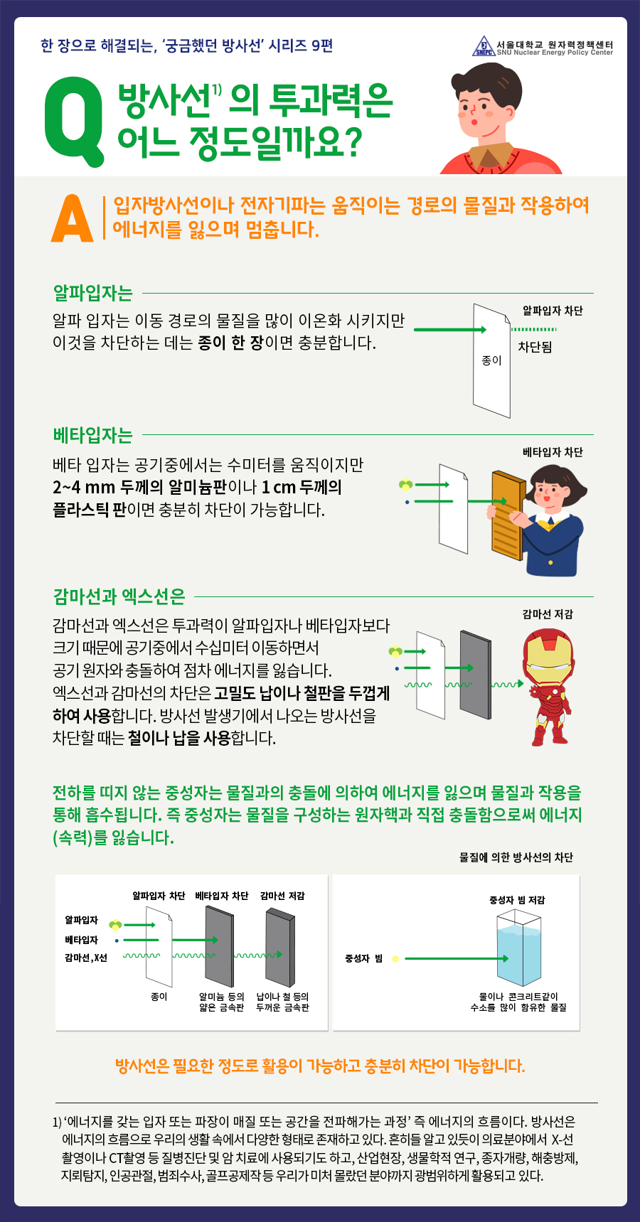 방사선의 입자의 종류를 알아보고 어떤 물질이 차단이 가능한지 알아봅니다.